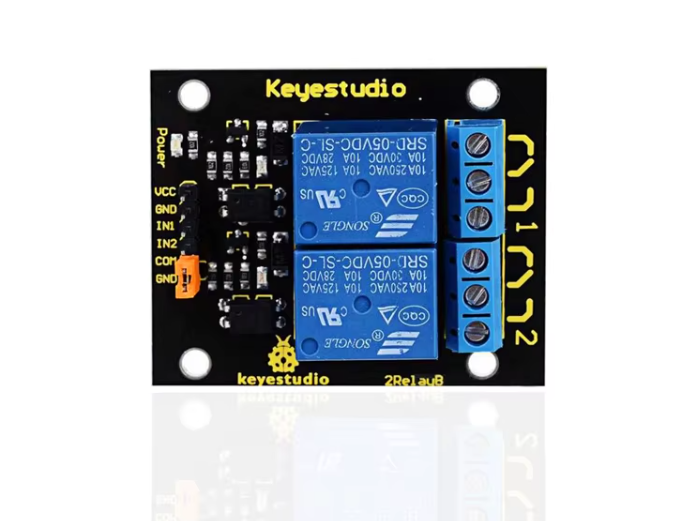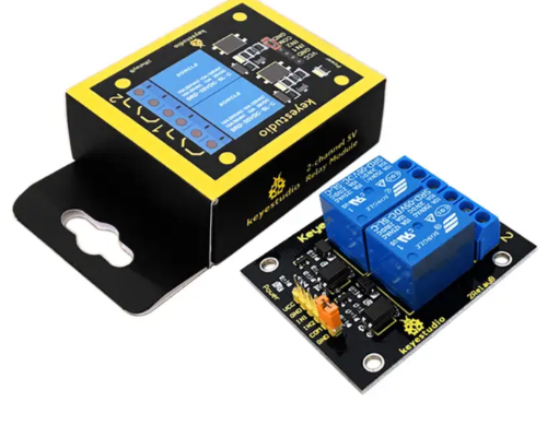 Das Keyestudio 2-Kanal Relaismodul (KS0057) ist ein vielseitiges Erweiterungsmodul zur sicheren Steuerung von externen Geräten über Mikrocontroller wie Arduino oder Micro:bit.